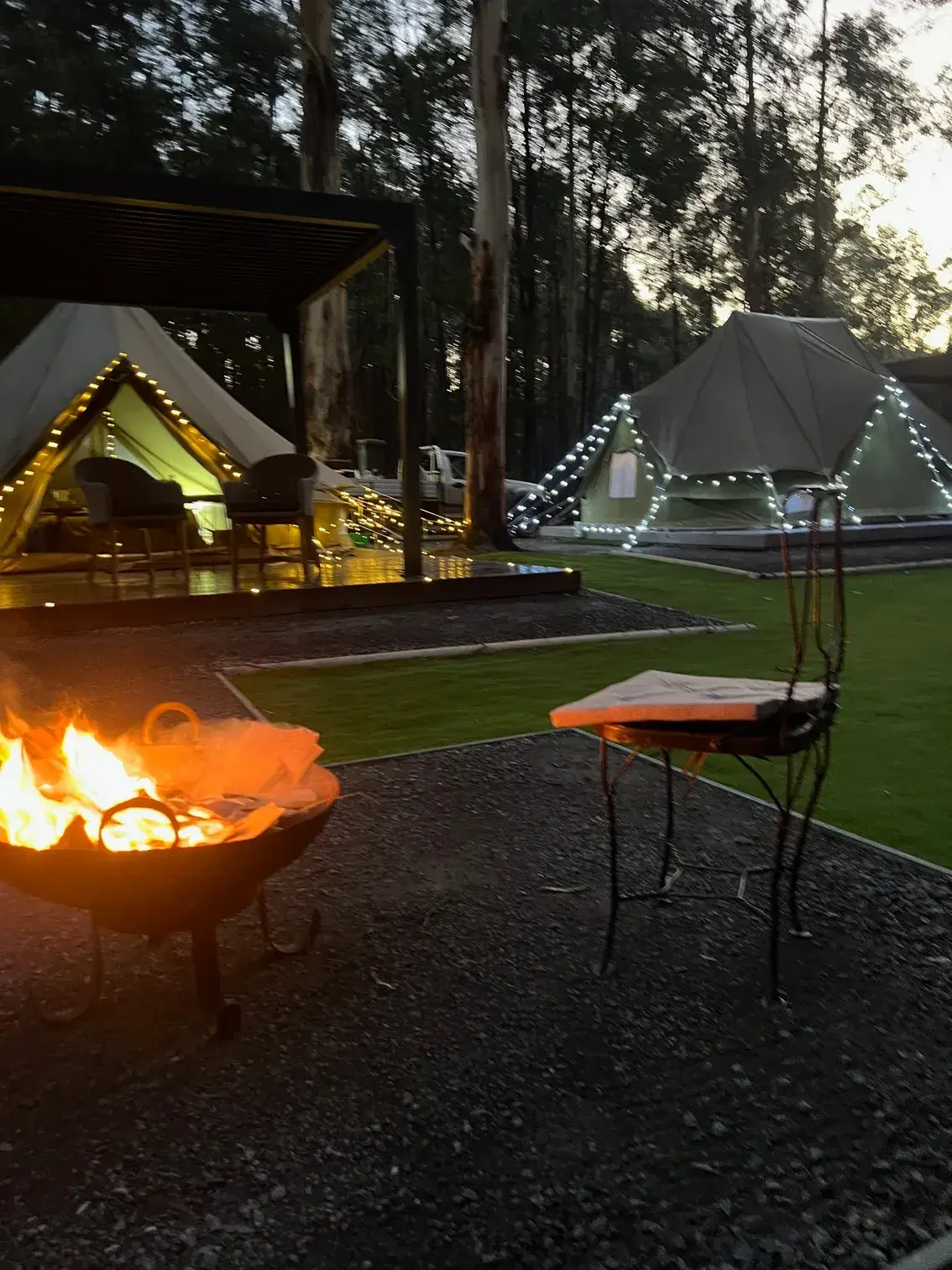 Marysville generally has lower ambient light due to its forested layout and small town size. Evenings feel still, shaded and quiet, contributing to a restful glamping experience.