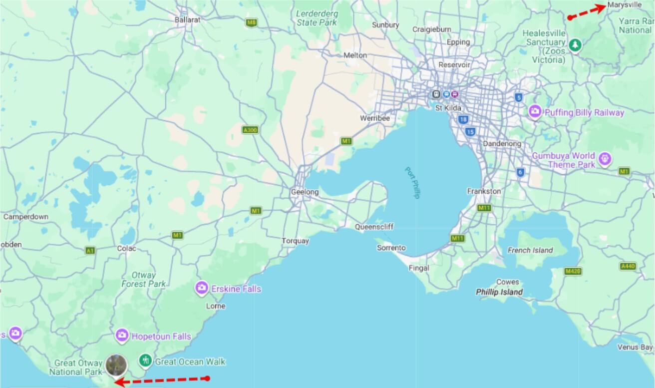 Marysville sits north-east of Melbourne, on the edge of the Yarra Ranges. The Otways stretch south-west, well beyond Geelong and along Victoria’s southern coastline. While both are forested regions, their position alone shapes how people experience them.